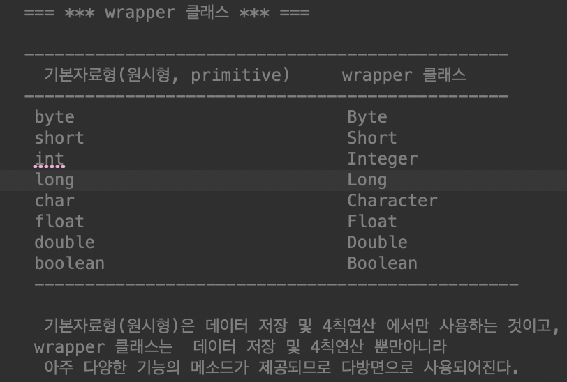 기본자료형과 매칭 되는 클래스를 적어둔 표다.